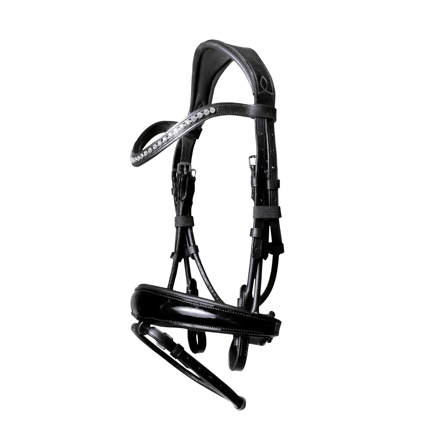 The 'Aurelie' premium leather bridle is made from super supple, rolled premium leather. It comes with a high gloss, broad patent leather gel-padded hanoverian noseband.