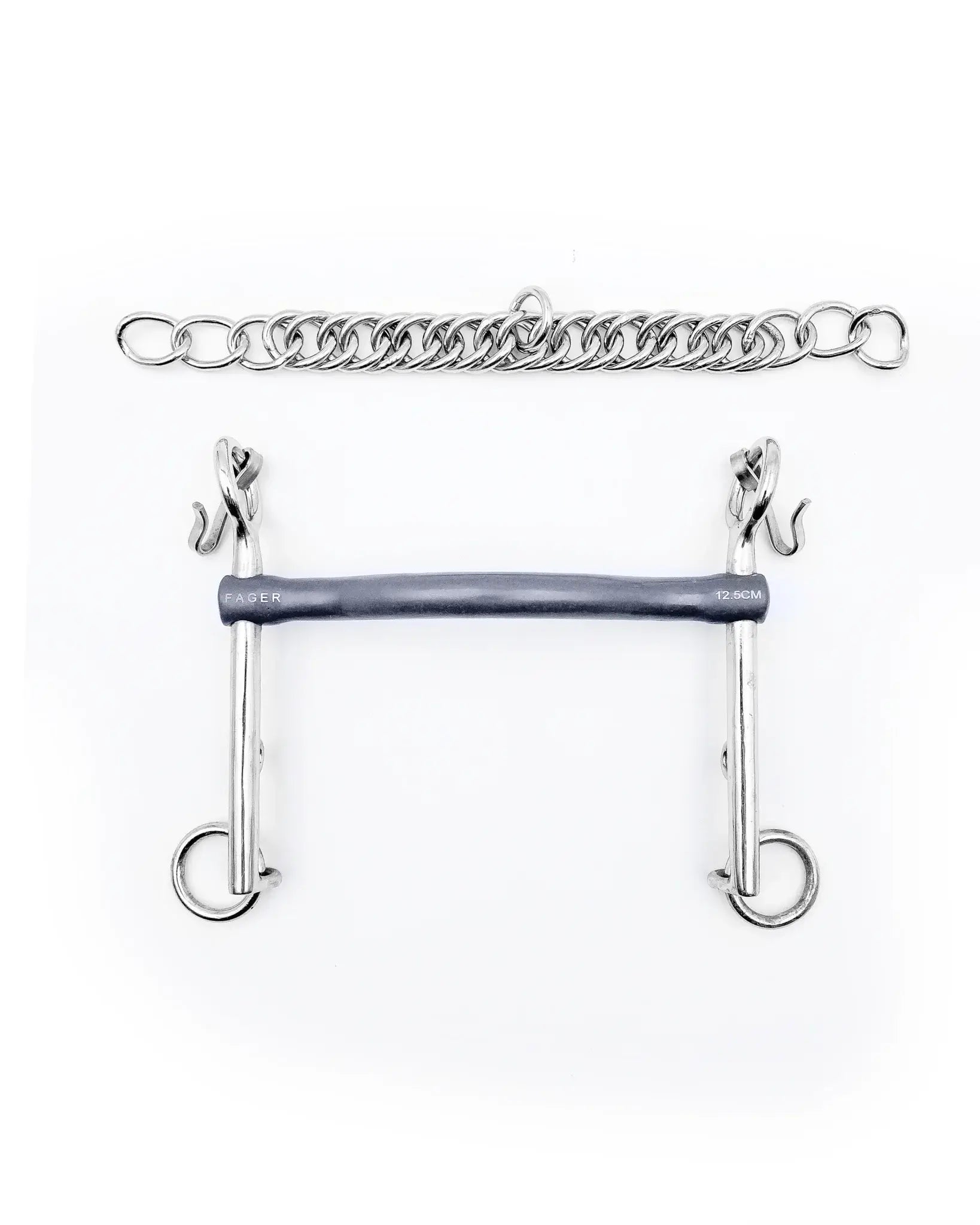 The chain is a key feature which acts to distribute the pressure between the mouth poll and chin. Hooks and chain are included.
